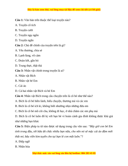 Câu 3: Nhân vật chính trong truyện là ai? A. Nhân vật Bích B. Nhân vật bé Em C. Cái áo