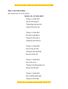 Câu 1: Bài thơ “Trăng ơi...từ đâu đến?” được viết theo thể thơ nào? A. Thơ tự do B. Thơ lục bát C. Thơ bốn chữ D. Thơ năm chữ