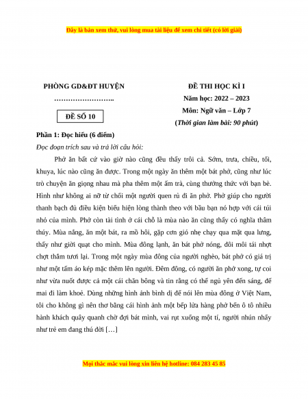 Môn: Ngữ văn – Lớp 7 ĐỀ SỐ 10