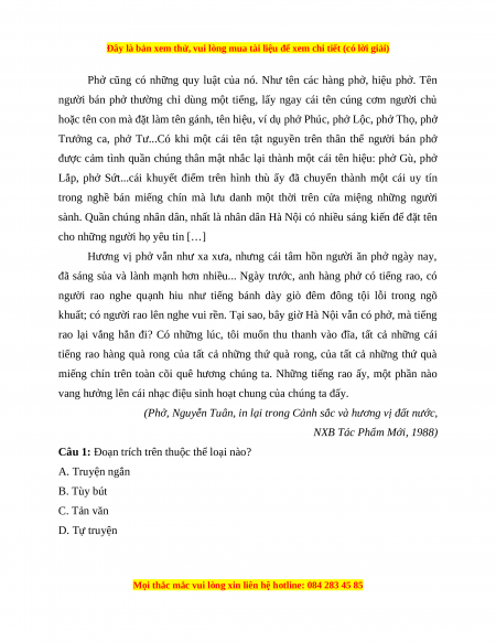 Câu 1: Đoạn trích trên thuộc thể loại nào? A. Truyện ngắn B. Tùy bút C. Tản văn D. Tự truyện