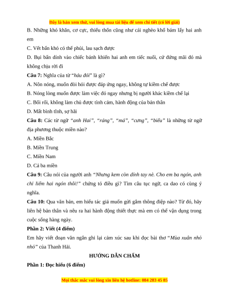A. Nôn nóng, muốn đòi hỏi được đáp ứng ngay, không tự kiềm Câu 7 0,5 điểm chế được Câu 8 C. Miền Nam 0,5 điểm