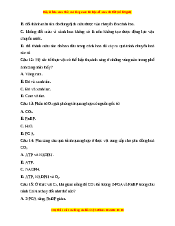 Câu 13: Phân tử O2 giải phóng từ quang hợp có nguồn gốc từ A. CO2. B. RuBP. C. H2O. D. PGA.