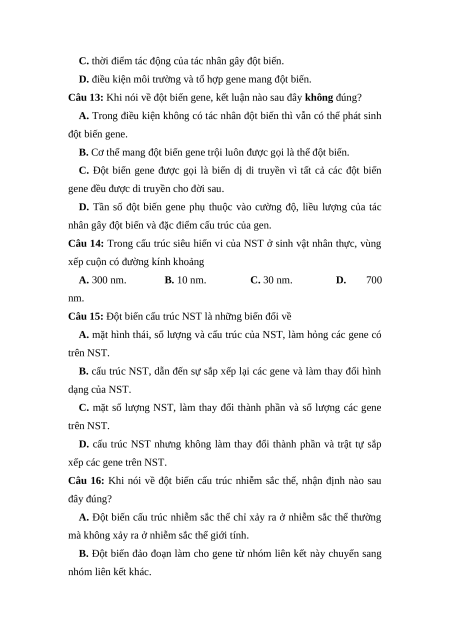 Câu 13: Khi nói về đột biến gene, kết luận nào sau đây không đúng?