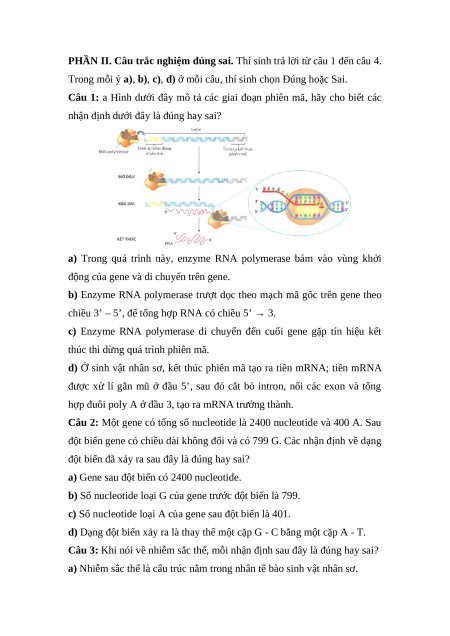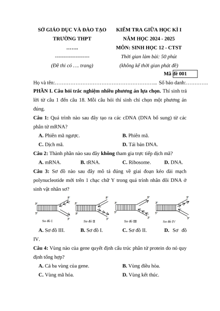 Câu 1: Quá trình nào sau đây tạo ra các cDNA (DNA bổ sung) từ các phân tử mRNA? A. Phiên mã ngược. B. Phiên mã. C. Dịch mã. D. Tái bản DNA.