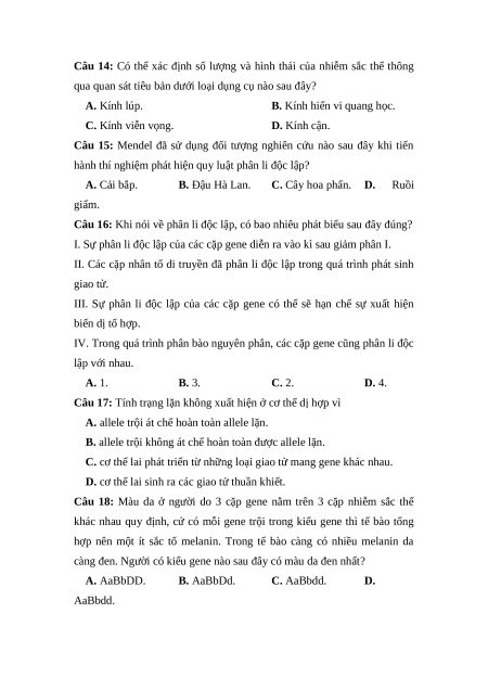 Câu 18: Màu da ở người do 3 cặp gene nằm trên 3 cặp nhiễm sắc thể