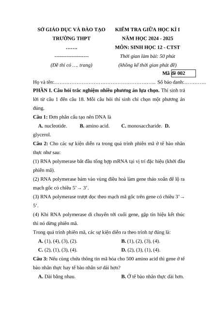 Câu 2: Cho các sự kiện diễn ra trong quá trình phiên mã ở tế bào nhân thực như sau:
