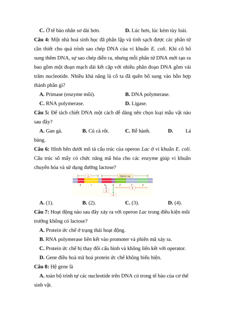 Câu 4: Một nhà hoá sinh học đã phân lập và tinh sạch được các phân tử
