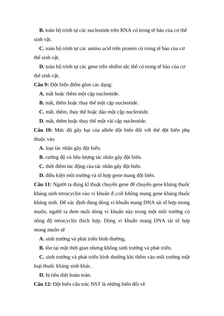 Câu 10: Mức độ gây hại của allele đột biến đối với thể đột biến phụ thuộc vào