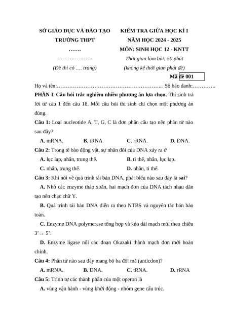 Đề thi giữa kì 1 Sinh học 12 Kết nối tri thức 2024 (Đề 1)