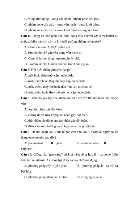 Câu 6: Trong cơ chế điều hoà hoạt động của operon lac ở vi khuẩn E.