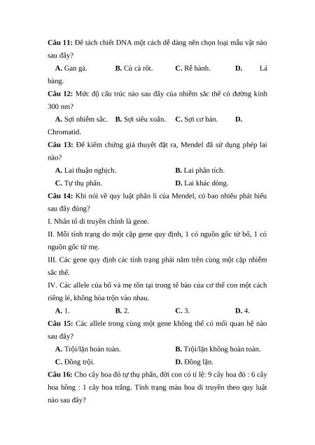 Câu 11: Để tách chiết DNA một cách dễ dàng nên chọn loại mẫu vật nào sau đây? A. Gan gà. B. Củ cà rốt. C. Rễ hành. D. Lá bàng.
