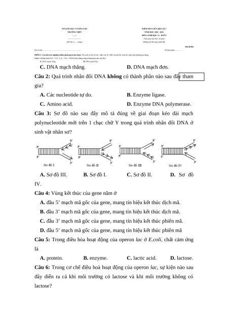Câu 2: Quá trình nhân đôi DNA không có thành phần nào sau đây tham gia?