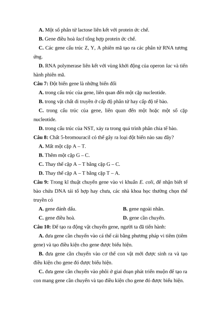Câu 5: Trong điều hòa hoạt động của operon lac ở E.coli, chất cảm ứng là A. protein. B. enzyme. C. lactic acid. D. lactose.