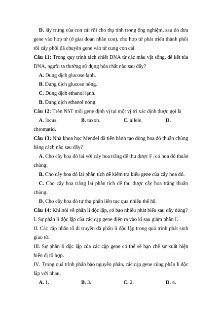 Câu 12: Trên NST mỗi gene định vị tại một vị trí xác định được gọi là A. locus. B. taxon. C. allele. D. chromatid.