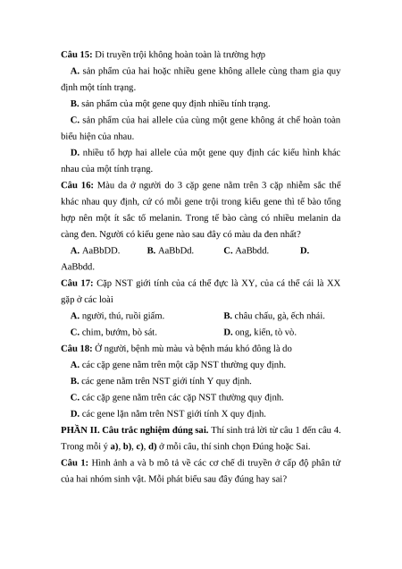 Câu 15: Di truyền trội không hoàn toàn là trường hợp
