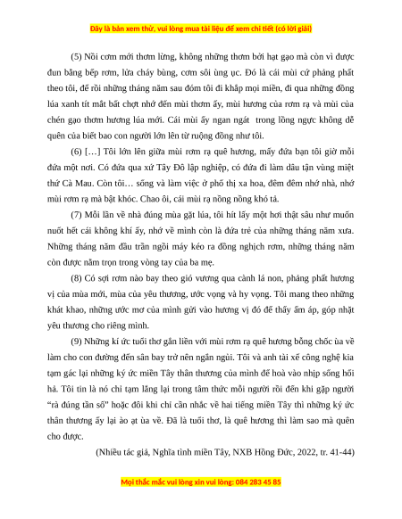 I. ĐỌC HIỂU (6,0 điểm) Đọc văn bản sau: MÙI RƠM RẠ QUÊ MÌNH… Ngọc Bích