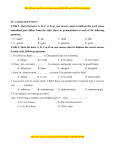 4. Last year I went to a party alone. I didn’t know any people there except the host. I was in a very ………..situation. A. embarrass B. embarrassing C. embarrassment D. embarrassingly