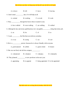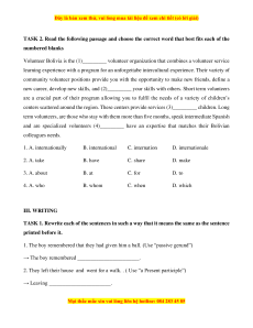 and are specialized volunteers (4)_________ have an expertise that matches their Bolivian colleagues needs. 1. A. internationally B. international C. internation D. internationale 2. A. take B. have C. share D. make 3. A. about B. at C. for D. to 4. A. who B. whom C. when D. which III. WRITING