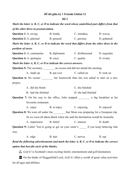 Đề thi giữa kỳ 1 Friends Global 12 Đề 2