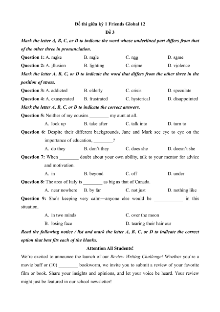 Đề thi giữa kỳ 1 Friends Global 12 Đề 3