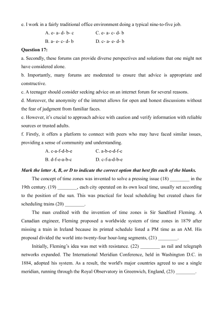 e. I work in a fairly traditional office environment doing a typical nine-to-five job. A. e- a- d- b- c C. e- a- c- d- b B. a- e- c- d- b D. c- a- e- d- b Question 17: