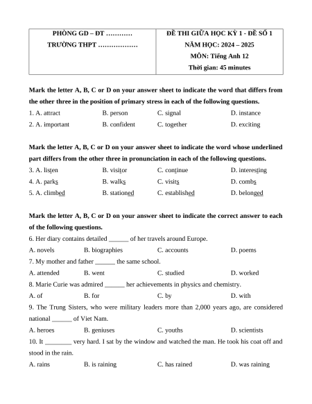NĂM HỌC: 2024 – 2025 MÔN: Tiếng Anh 12 Thời gian: 45 minutes
