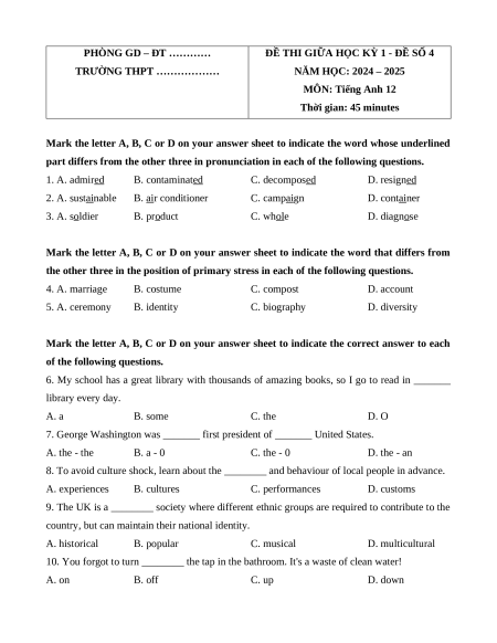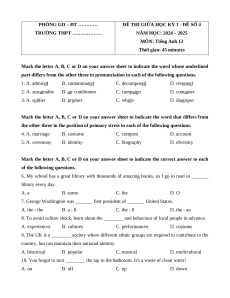 NĂM HỌC: 2024 – 2025 MÔN: Tiếng Anh 12 Thời gian: 45 minutes