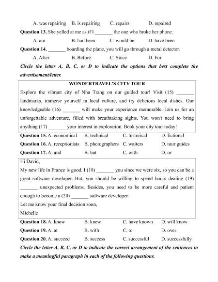 Let me know your final decision soon, Michelle Question 18. A. know B. knew C. have known D. will know Question 19. A. at B. with C. to D. over Question 20. A. succeed B. success C. successful D. successfully