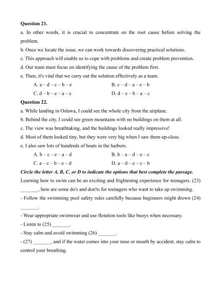 e. Then, it's vital that we carry out the solution effectively as a team. A. a – d – c – b – e B. c – d – a – e – b C. d – b – e – a – c D. d – e – b – a – c Question 22.