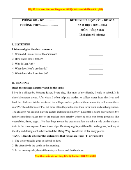 1. When did Lina arrive at Hoa’s house? __________ 2. How old is Hoa’s father? __________ 3. Who is Lan Anh? __________
