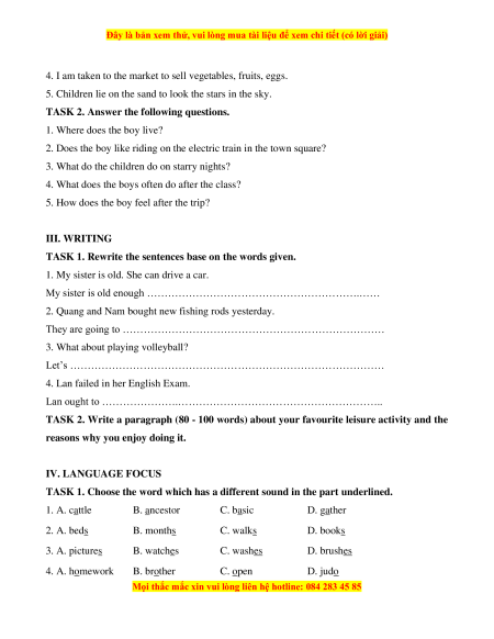 2. They are going to go fishing. 3. Let’s play volleyball. 4. Lan ought to study harder. IV. LANGUAGE FOCUS TASK 1. 1. C; 2. A; 3. A; 4. B