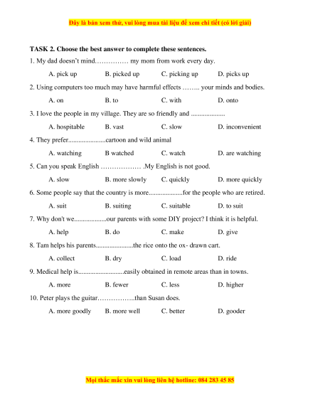 1. My dad doesn’t mind…………… my mom from work every day. A. pick up B. picked up C. picking up D. picks up