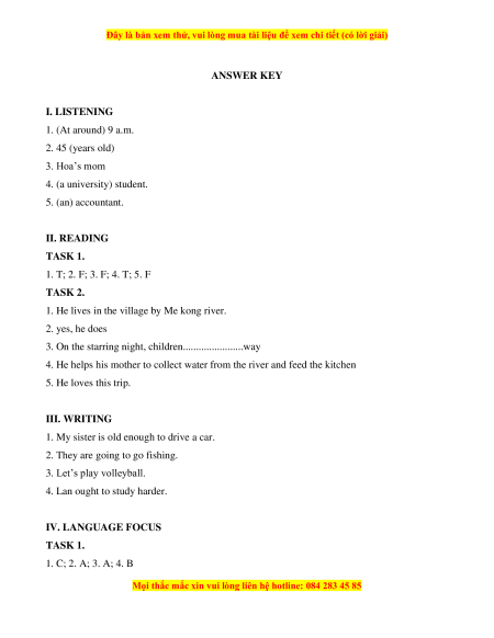 ANSWER KEY I. LISTENING 1. (At around) 9 a.m. 2. 45 (years old) 3. Hoa’s mom 4. (a university) student. 5. (an) accountant. II. READING TASK 1. 1. T; 2. F; 3. F; 4. T; 5. F TASK 2.