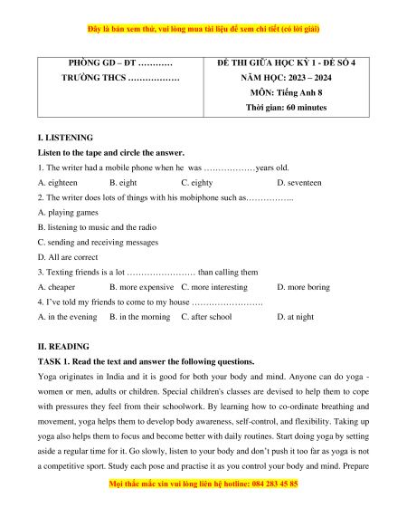 Đề thi giữa kì 1 Tiếng Anh 8 Global success (Đề 4 kèm file nghe)
