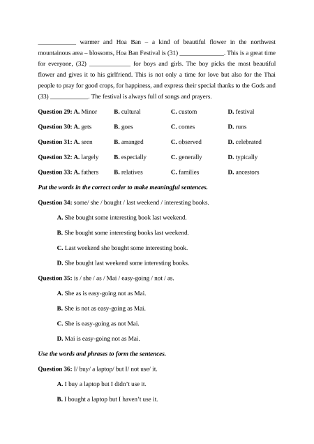 (33) ____________. The festival is always full of songs and prayers. Question 29: A. Minor B. cultural C. custom D. festival Question 30: A. gets B. goes C. comes D. runs Question 31: A. seen B. arranged C. observed D. celebrated Question 32: A. largely B. especially C. generally D. typically Question 33: A. fathers B. relatives C. families D. ancestors