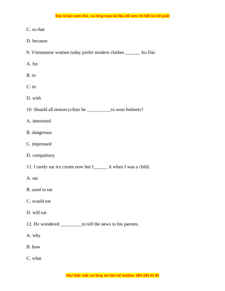 9: Vietnamese women today prefer modern clothes ______ Ao Dai. A. for B. to C. in D. with
