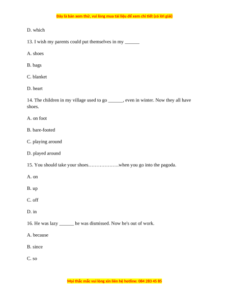 14. The children in my village used to go ______, even in winter. Now they all have shoes. A. on foot B. bare-footed C. playing around D. played around