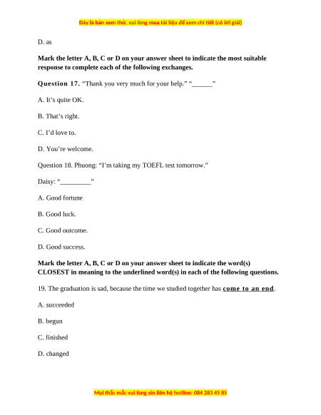 Question 18. Phuong: “I’m taking my TOEFL test tomorrow.” Daisy: “_________” A. Good fortune B. Good luck. C. Good outcome. D. Good success.