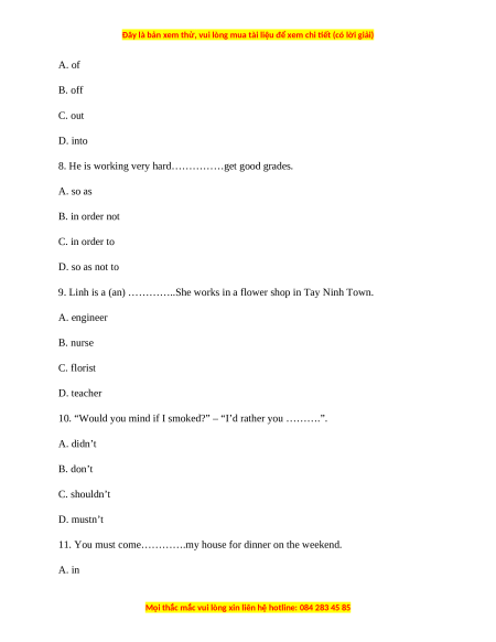 9. Linh is a (an) …………..She works in a flower shop in Tay Ninh Town. A. engineer B. nurse C. florist D. teacher