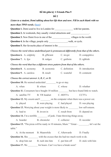 Đề thi giữa kì 1 Tiếng Anh 9 Friends Plus (Đề 2 có file nghe)