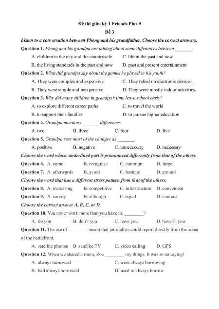 Đề thi giữa kì 1 Tiếng Anh 9 Friends Plus (Đề 3 có file nghe)