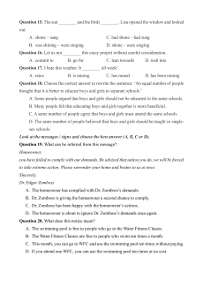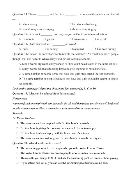 Question 15. The sun ________ and the birds ________. Lisa opened the window and looked out. A. shone – sang C. had shone – had sung