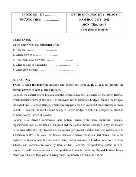 NĂM HỌC: 2024 – 2025 MÔN: Tiếng Anh 9 Thời gian: 60 minutes I. LISTENING
