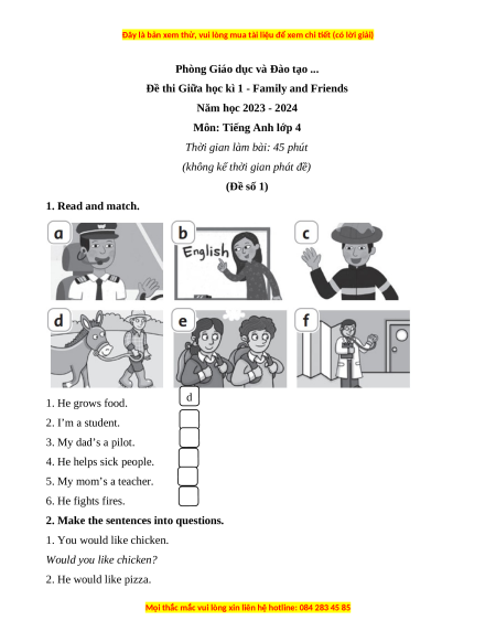 (không kể thời gian phát đề) (Đề số 1) 1. Read and match. 1. He grows food. d 2. I’m a student. 3. My dad’s a pilot. 4. He helps sick people. 5. My mom’s a teacher. 6. He fights fires.