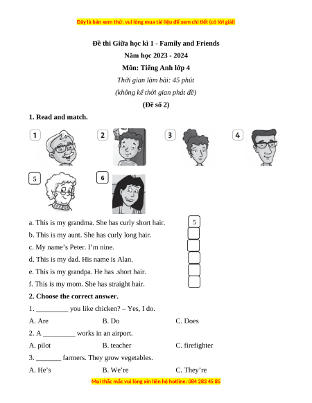 Đề thi Giữa học kì 1 - Family and Friends Năm học 2023 - 2024