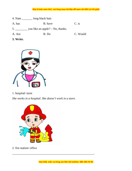 5. ________ you like an apple? – No, thanks. A. Are B. Do C. Would 3. Write. 1. hospital/ store