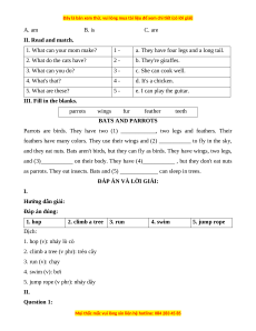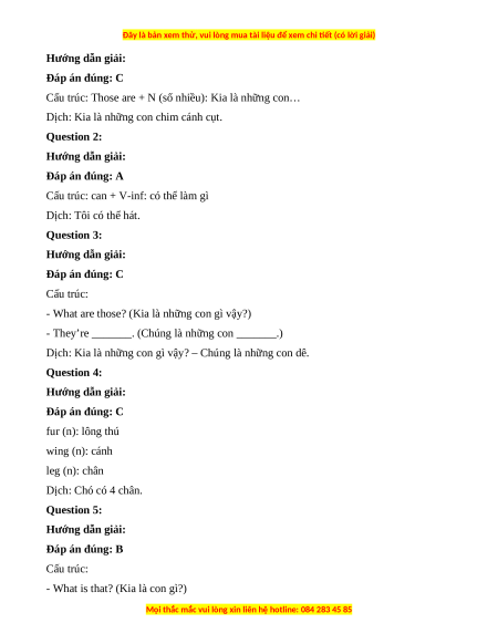 Dịch: Kia là những con gì vậy? – Chúng là những con dê. Question 4: Hướng dẫn giải: Đáp án đúng: C fur (n): lông thú wing (n): cánh leg (n): chân Dịch: Chó có 4 chân. Question 5: Hướng dẫn giải: Đáp án đúng: B Cấu trúc: