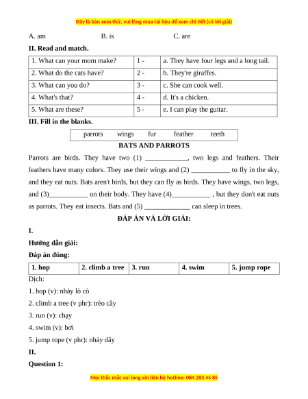 ĐÁP ÁN VÀ LỜI GIẢI: I. Hướng dẫn giải: Đáp án đúng: 1. hop 2. climb a tree 3. run 4. swim 5. jump rope Dịch: 1. hop (v): nhảy lò cò
