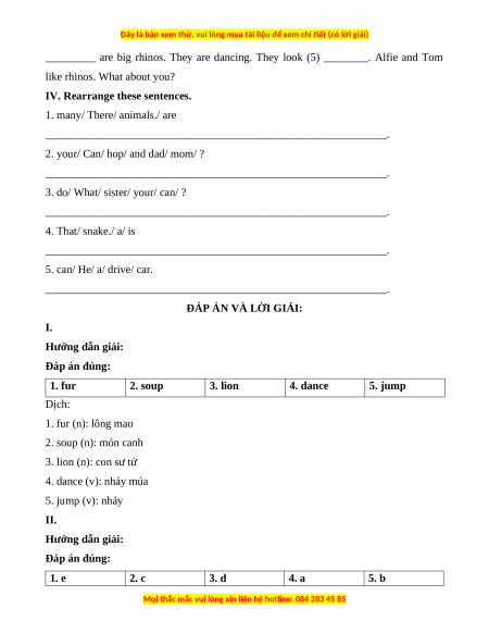ĐÁP ÁN VÀ LỜI GIẢI: I. Hướng dẫn giải: Đáp án đúng: 1. fur 2. soup 3. lion 4. dance 5. jump Dịch: 1. fur (n): lông mao 2. soup (n): món canh 3. lion (n): con sư tử 4. dance (v): nhảy múa 5. jump (v): nhảy II. Hướng dẫn giải: Đáp án đúng: 1. e 2. c 3. d 4. a 5. b
