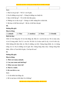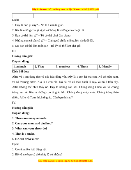 5. Mẹ bạn có thể làm món gì? – Bà ấy có thể làm chả giò. III. Hướng dẫn giải: Đáp án đúng: 1. animals 2. That 3. monkeys 4. Those 5. friendly Dịch bài đọc: